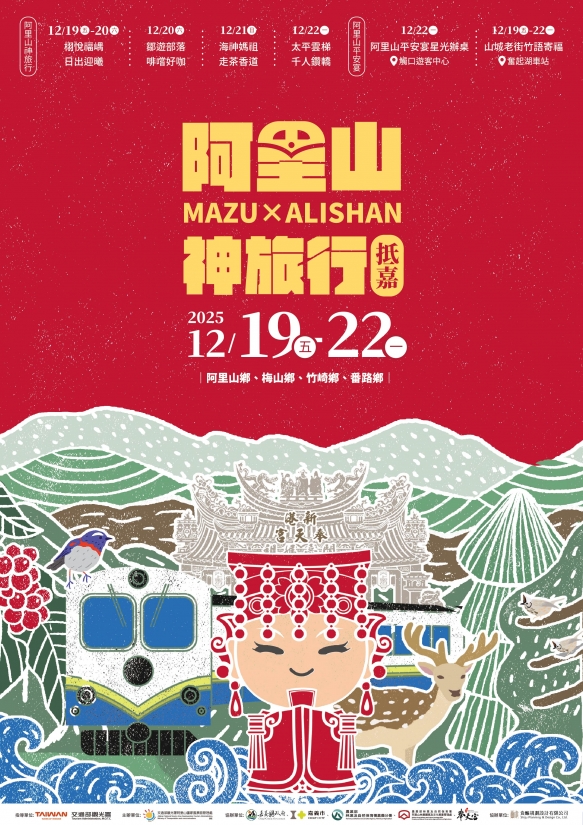 主辦單位誠摯邀請全台民眾,在12月19號到22號期間,一起來到嘉義,跟隨媽祖的腳步,體驗這場結合自然美景與文化底蘊的「神之旅」。活動詳情請上「阿里山 新印象」臉書粉絲專頁查詢。