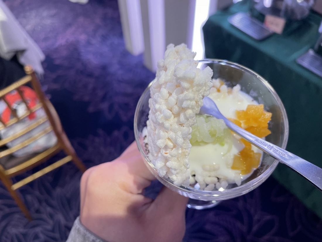 本次所發表的「米冰淇淋佐鳳梨佛手瓜果醬」創意甜點,以幸福嘉義米的米香為基底,打造酥脆口感;選用在地鳳梨與奮起湖佛手瓜製成果醬堆疊甜味;再搭配幸福嘉義米冰淇淋。這道甜點不僅結合嘉義在地元素與創意,亦提供一個獨特且令人印象深刻的甜點體驗,絕妙滋味獲得現場出席貴賓的一致好評。